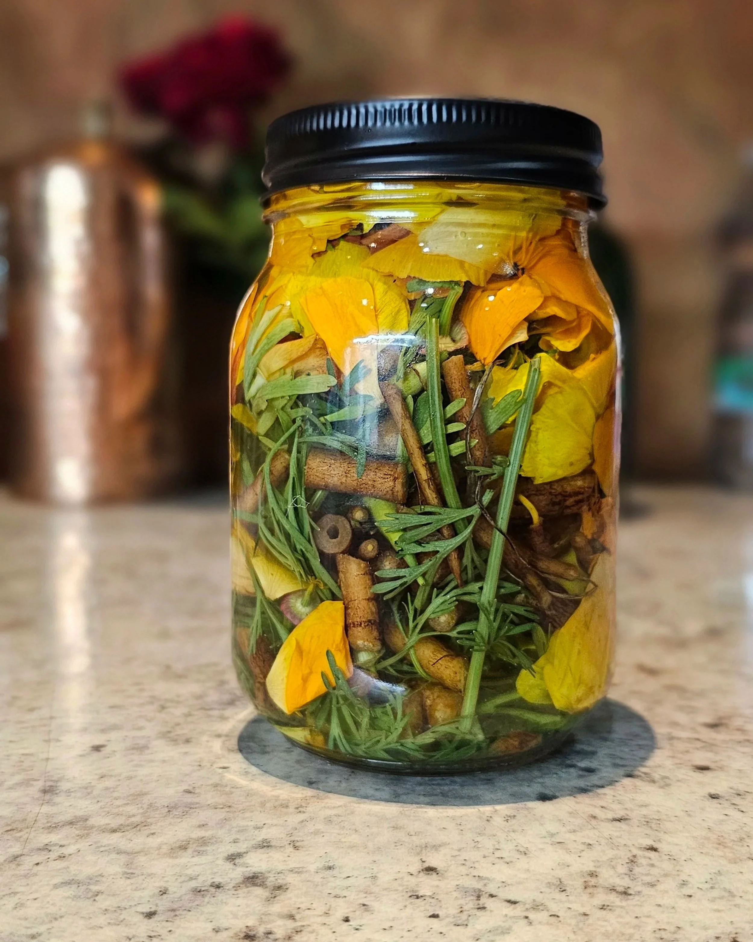 Rose has been a very close ally this season. I was gifted many beautiful Roses from my mum, Damask + Galica, fragrant and so yummy. I love this combo of Rose + Lemon Balm and very often have them as tea, so felt aligned to bring them together with Cali Poppy. Roses are all about the heart, beautiful for grief, sadness, when our hearts feel broken. They are heart protectors, keeping the hearts open when theres a tendency to withdraw, shut down, but at the same time Rose also teaches us when to protect our hearts, discernment + healthy boundaries.. They are love and ancient medicines, quintessential Venus plant that many of us feel deeply connected to. Physically, Rose has many herbal actions and affinities within the body. They act as a tonic astringent, inflammation modulating, gentle nervine, antioxidant, emmenagogue. They help to cool down excess heat and reduce inflammation throughout the body, in addition to moving stagnant blood and tightening loose, lax tissues. Roses offer support to the cardiovascular, digestive, respiratory, and female repro systems. They act as a gentle relaxant for the nervous system, assisting in the alleviation of mental excess, anxiety, or stress.